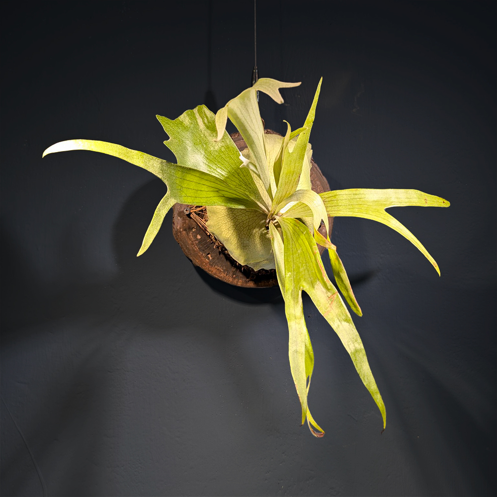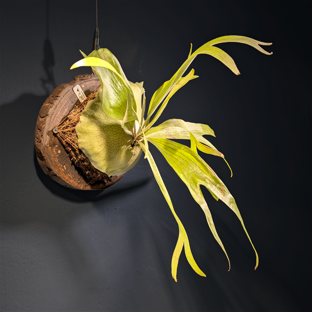 | 視內蕨小檔案 品種:細葉二叉鹿角蕨 Platycerium bifurcatum (Cav.) C.Chr. 視內蕨編號:No.18木板_原木厚切片+細葉二叉鹿角蕨 18種原生種之一,原產於澳洲東海岸,地區橫跨熱帶到溫帶,個體變化多樣,最早普遍在台灣的鹿角蕨品種,所以非常適應台灣環境,好照顧且生長快速,非常適合新手入門,容易獲得成就感!