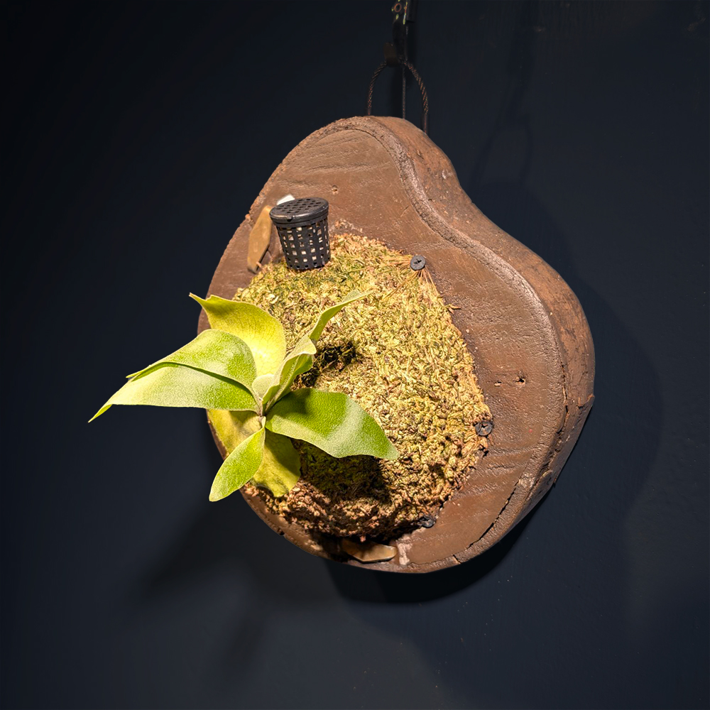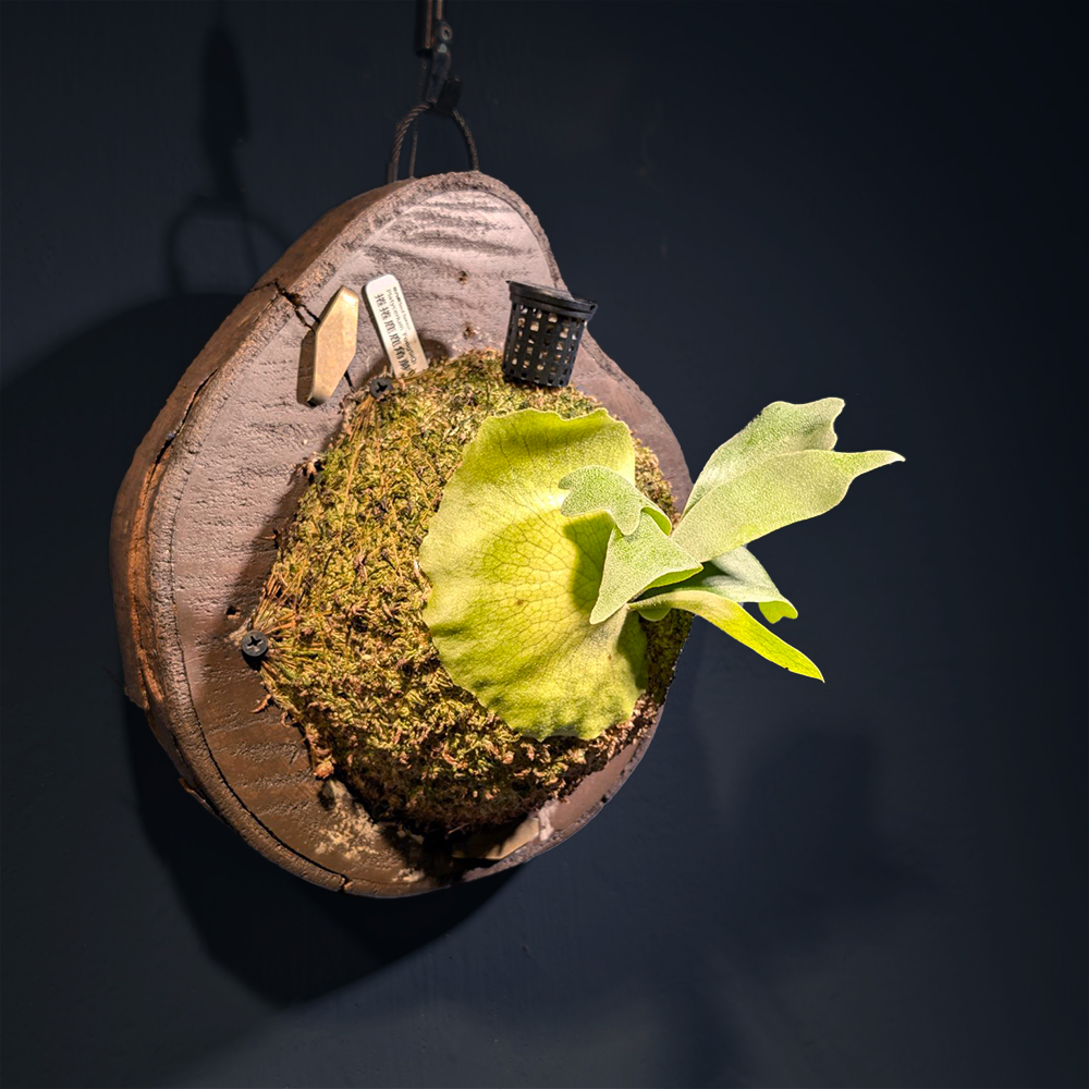🌿 捲捲鹿鹿角蕨的甦醒時刻捲捲鹿鹿角蕨 No.51「微捲初醒」,葉片剛從核心展開,捲度尚未完全張揚,線條集中而內斂。此刻的姿態像剛醒來的呼吸,帶著安靜卻清晰的生命感。 作為捲捲鹿鹿角蕨的一株單株紀錄,No.51呈現的是捲度尚在醞釀的階段,是從嫩葉走向成熟捲曲之前的過渡時刻。 🌱 生長狀態與葉形特徵此株捲捲鹿鹿角蕨葉片向外展開,中央葉脈清楚,邊緣微微內捲。營養葉完整貼合水苔基質,整體結構穩定,屬於健康生長中的展章階段。 在光線下可見葉面細緻絨感,呈現捲捲鹿鹿角蕨特有的柔和綠色層次。 🪵 上板方式與植栽配置本株已完成上板處理,固定於植栽板上,使用水苔作為基質,利於透氣與排水。適合室內明亮散射光環境養護。 鹿角蕨上板形式不僅方便展示,也能完整呈現單株姿態,是許多鹿角蕨收藏者偏好的養護方式。 🌿 關於視內蕨的單株紀錄視內蕨以編號方式記錄每一株鹿角蕨的生長狀態。 每一株都是獨立個體,照片即為實際植株狀態。